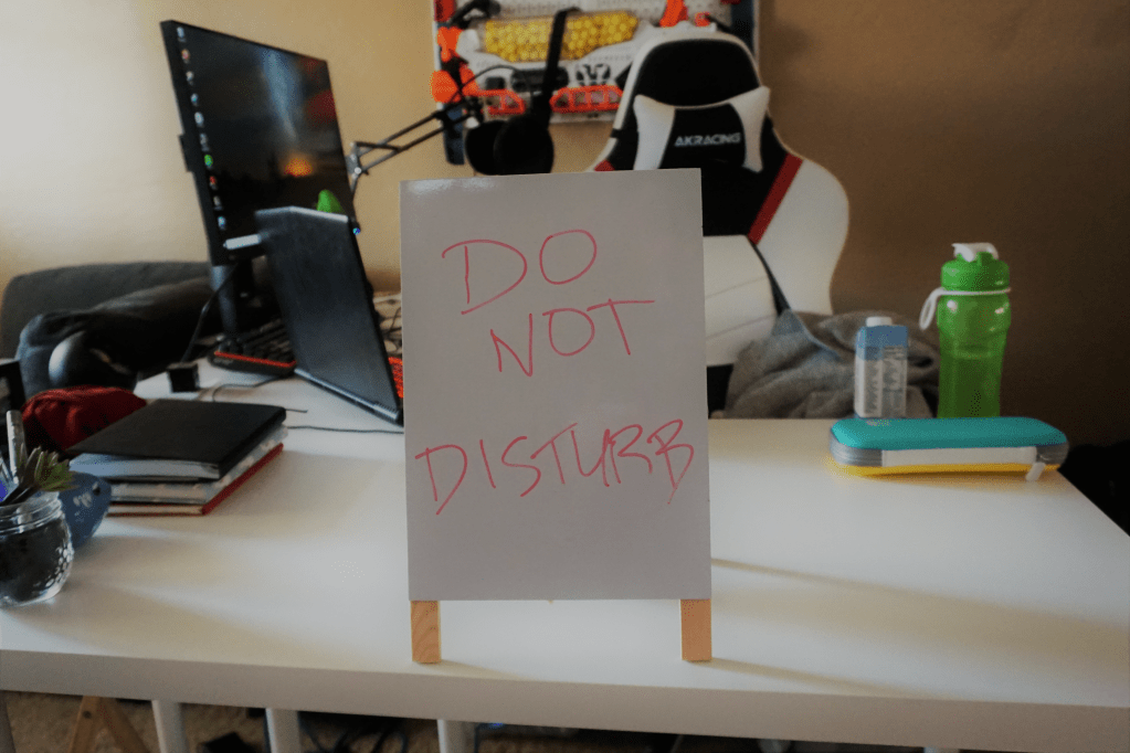 Once the husband and our housemate had to switch to working from home and doing school from home, respectively, I had to rearrange furniture and relinquish my home office. Now my work space is downstairs in an open area. (It would be cool to have a door I can close again, but at least we have enough room that I could make this space for myself.)